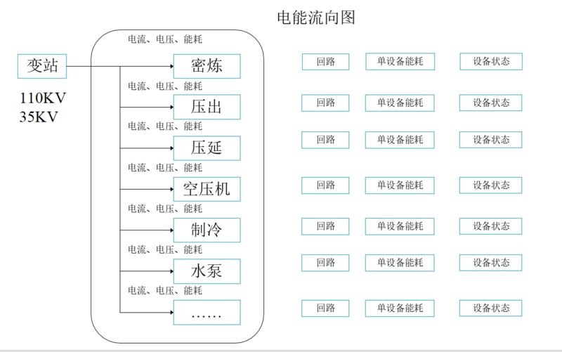 系统以工序树形结构的形式展示全公司电能流向图,包括变电站的功率,各种工序的功率、能耗、电能参数,设备的工作状态,是否过压过在等信息。