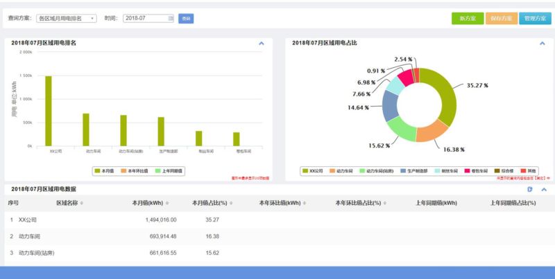 功能介绍:主要展示厂区内所有区域的能耗量以及能耗排名、能耗占比,使管理人员了解全厂的重点用能区域。